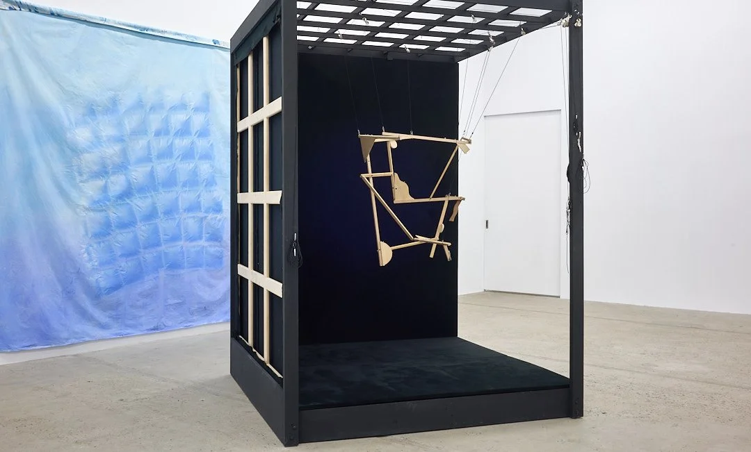Anthony Burnham, Marionnette, 2024. Installation: contreplaqué, tissu molleton, tilleul, cordelettes et poulies, 210 x 166 x 166 cm.